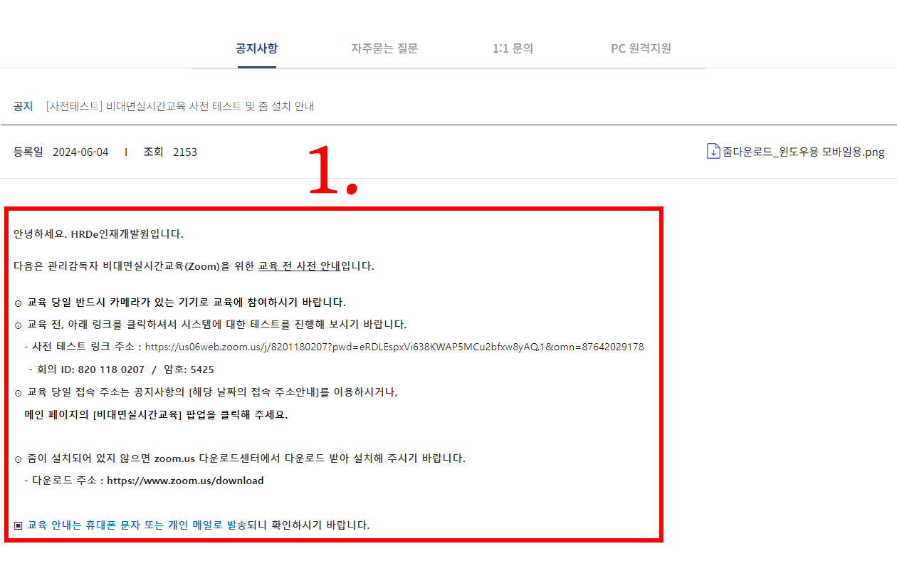 zoom 교육전 사전테스트 공지사항 내용을 읽고 준비하시기바랍니다.