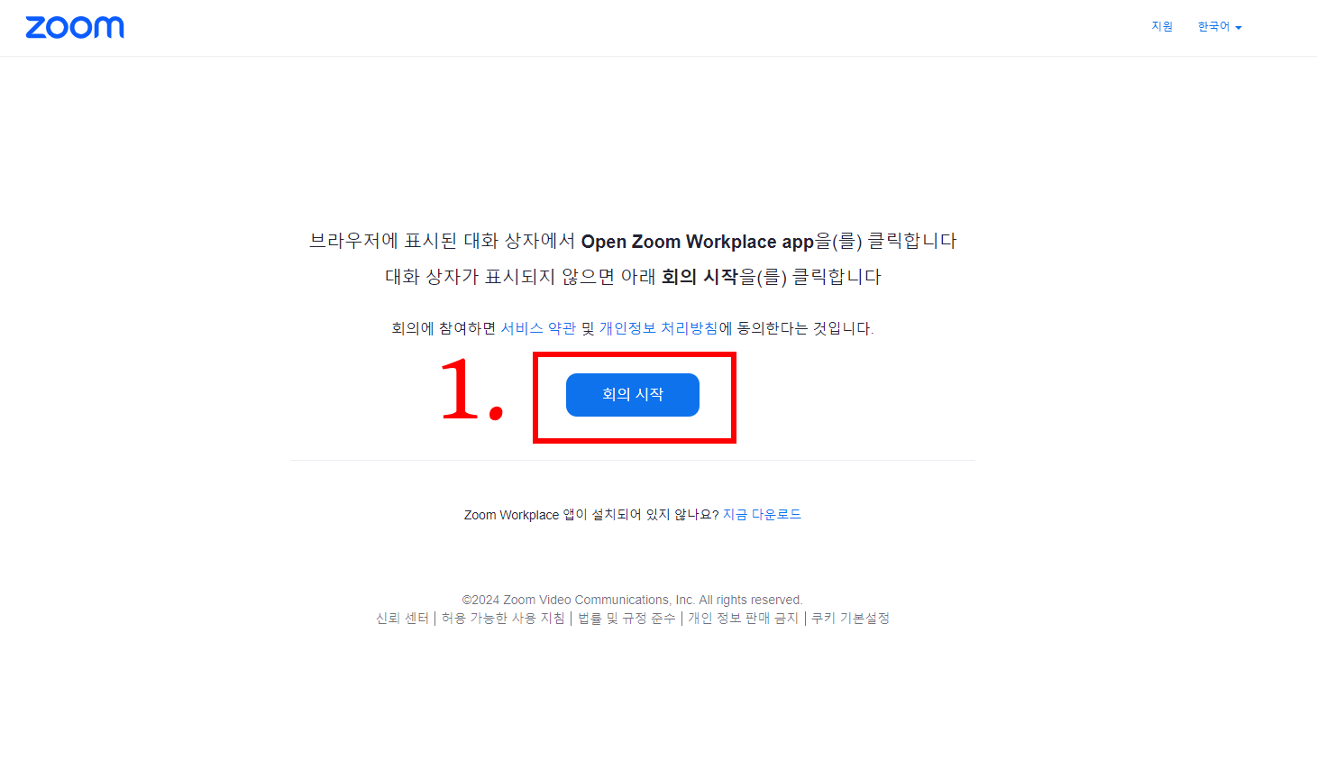 1. 교육 참여 팝업을 클릭하거나, 2. 교육 날짜의 공지사항 접속주소로 접속시 zoom 회의 대기실로 이동됩니다. 대기실 화면이 뜨지않는다면 회의시작 버튼을 눌러주세요. * zoom 미설치시 https://www.zoom.us/download 다운로드 받아 설치해주시기 바랍니다. |